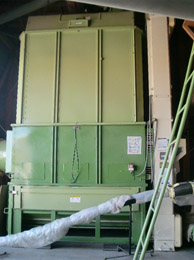 まとめて籾摺りをするために、乾燥させた籾は一時このタンクに保管します。約5,500kg=5.5トン入ります。その重さに耐えられるように、頑丈な作りになっています。ここから下の籾摺機に、籾は落ちて入って行きます。