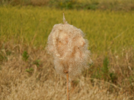 まず、奇妙な綿菓子のように見えるものです。さてこれは、いったい何でしょう、刈り取りの終えた田んぼを背景に存在しています。